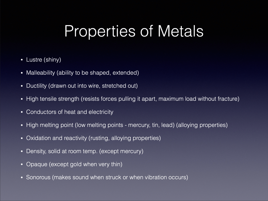 This presentation will explain the properties of the metals family, and the differences between various metals. Although they all have the same characteristic properties, they differ in scale of each of these properties.