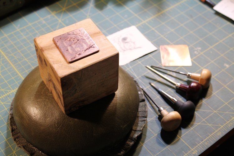 Engraving a copper plate using metal engraving tools, supporting the copper on an engravers pad and wooden block.Nine different types of printmaking shown using the same basic design. You can see the character changes according to the m=printmaking method used.Small press along with the glass plate, brayer ink, ink knives, papers, wetting and blotting trays.