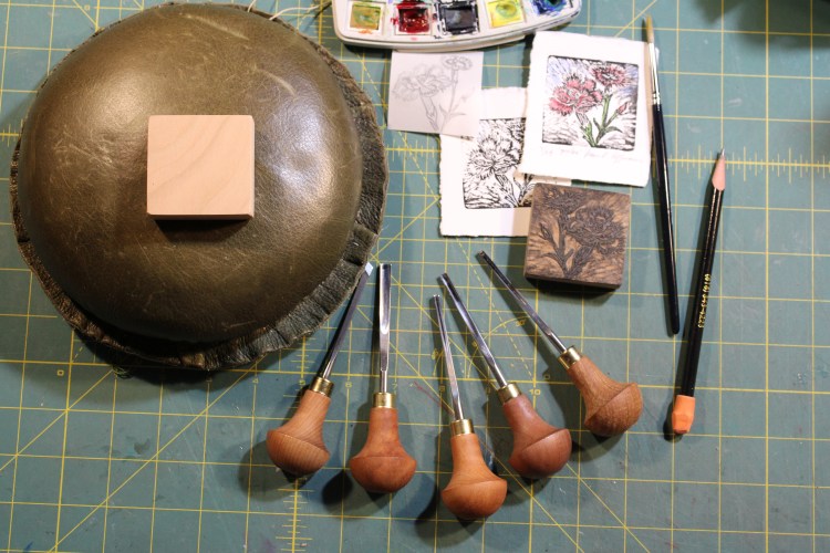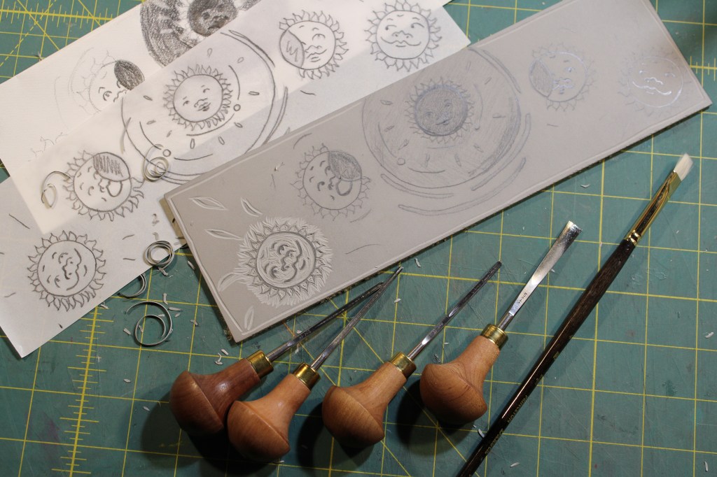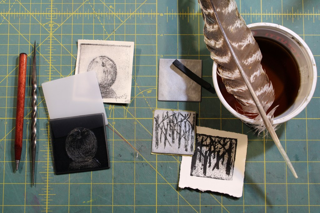 Wood engraving using engraving tools on boxwood end grain.Wood engraving using engraving tools to cut the end grain of a maple block.Drypoint needles and acrylic plate on the left and Lithography crayon and aluminum plate along with mild etchant and feather on right.