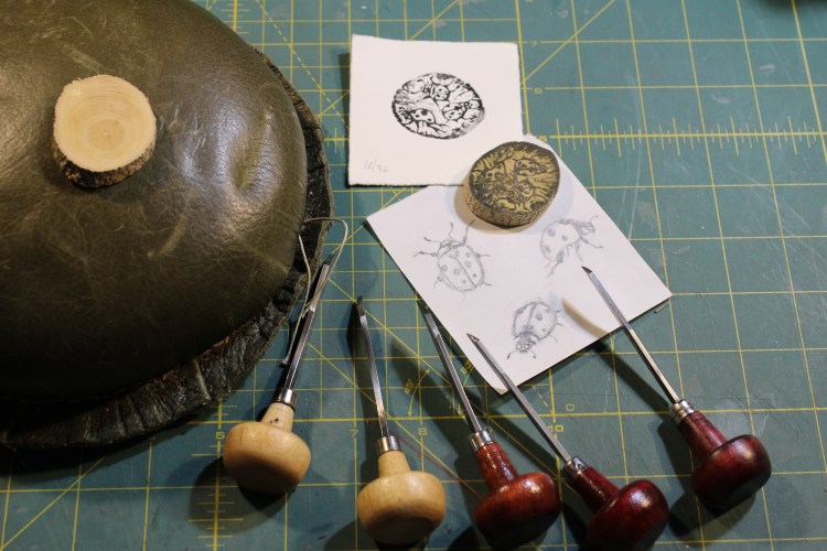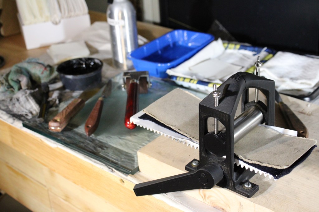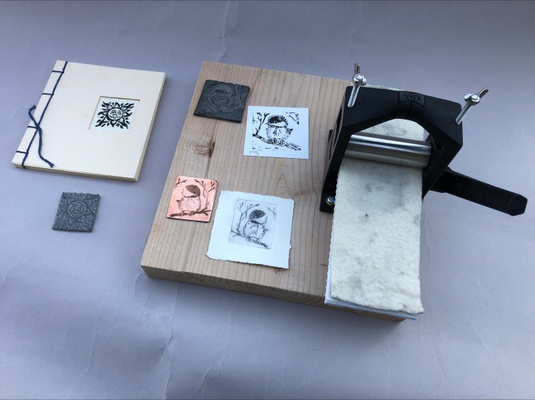 Woodcut using u and v shaped gouges to cut into side grain cherry wood.Small press showing samples of plates to print. The linocut (on the left) was hand rubbed not run through the press. Linocut using u anv v gouges to carve into the surface to create print pattern.