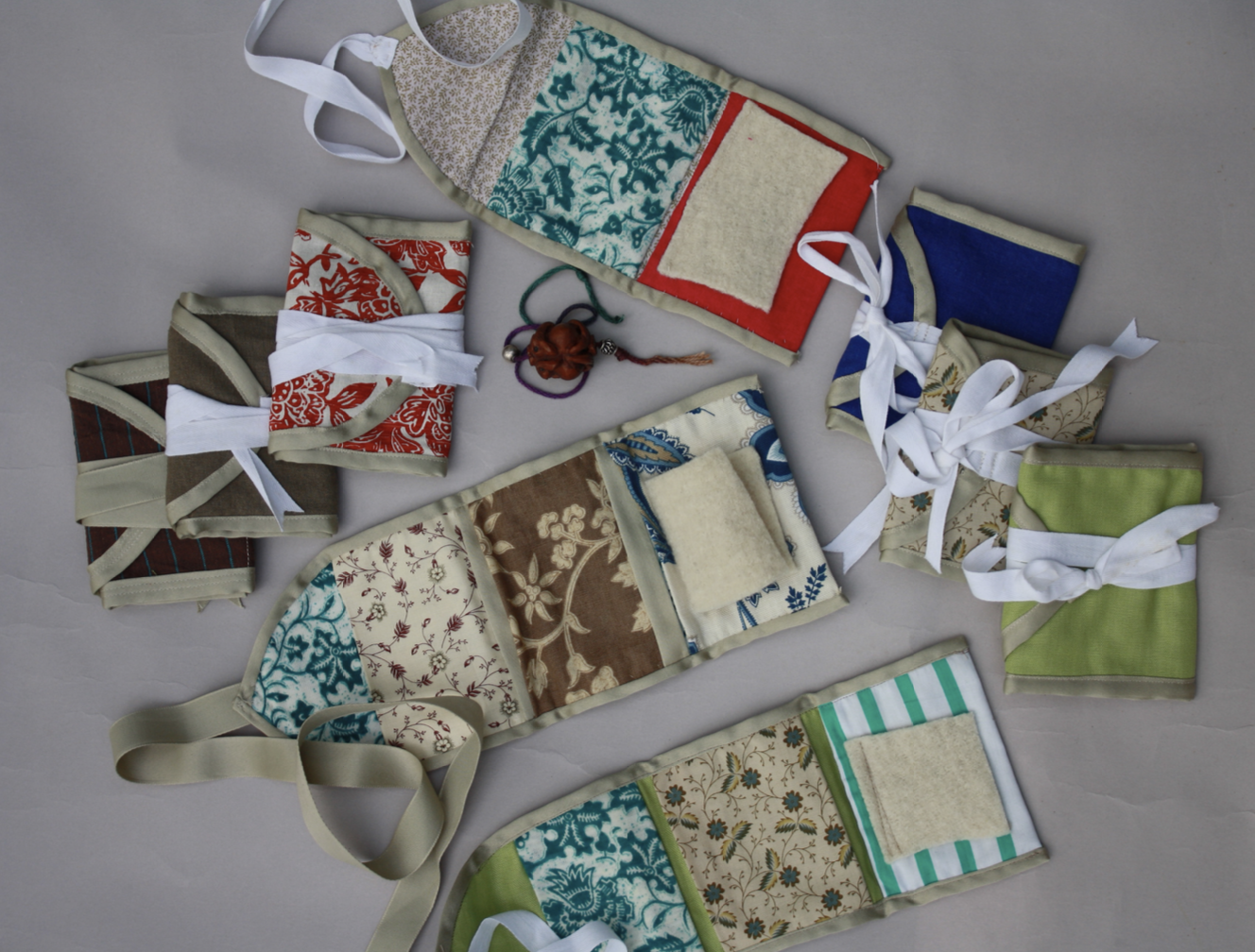 Throughout history people have found ways to make scraps useful, and these ‘hussifs’ (short for housewife’s) are no exception! They were widely used in the 17th through 19th centuries by thrifty sewers who needed their supplies close at hand for mending or sewing with easily accessible equipment at hand. These are made from period correct materials. They can be ordered completely hand sewn or machine sewn, or in kits including patterns with assembly instructions. Or, classes can be created including these and projects using your own materials or supplied fibers. All you need is colorful scraps of cloth and wool.